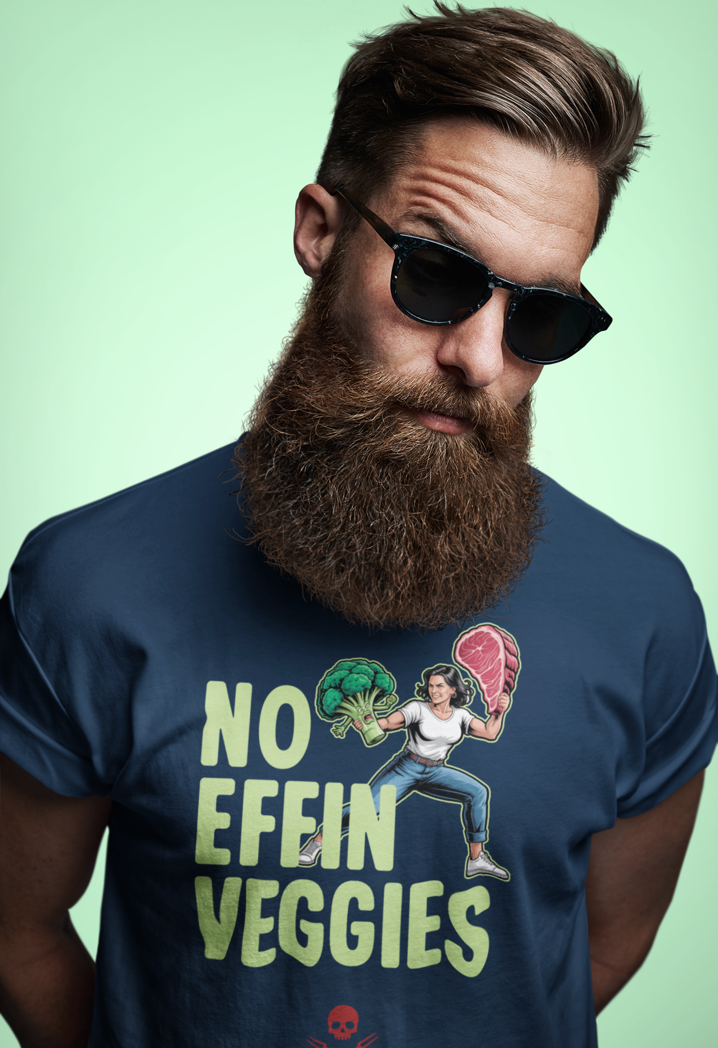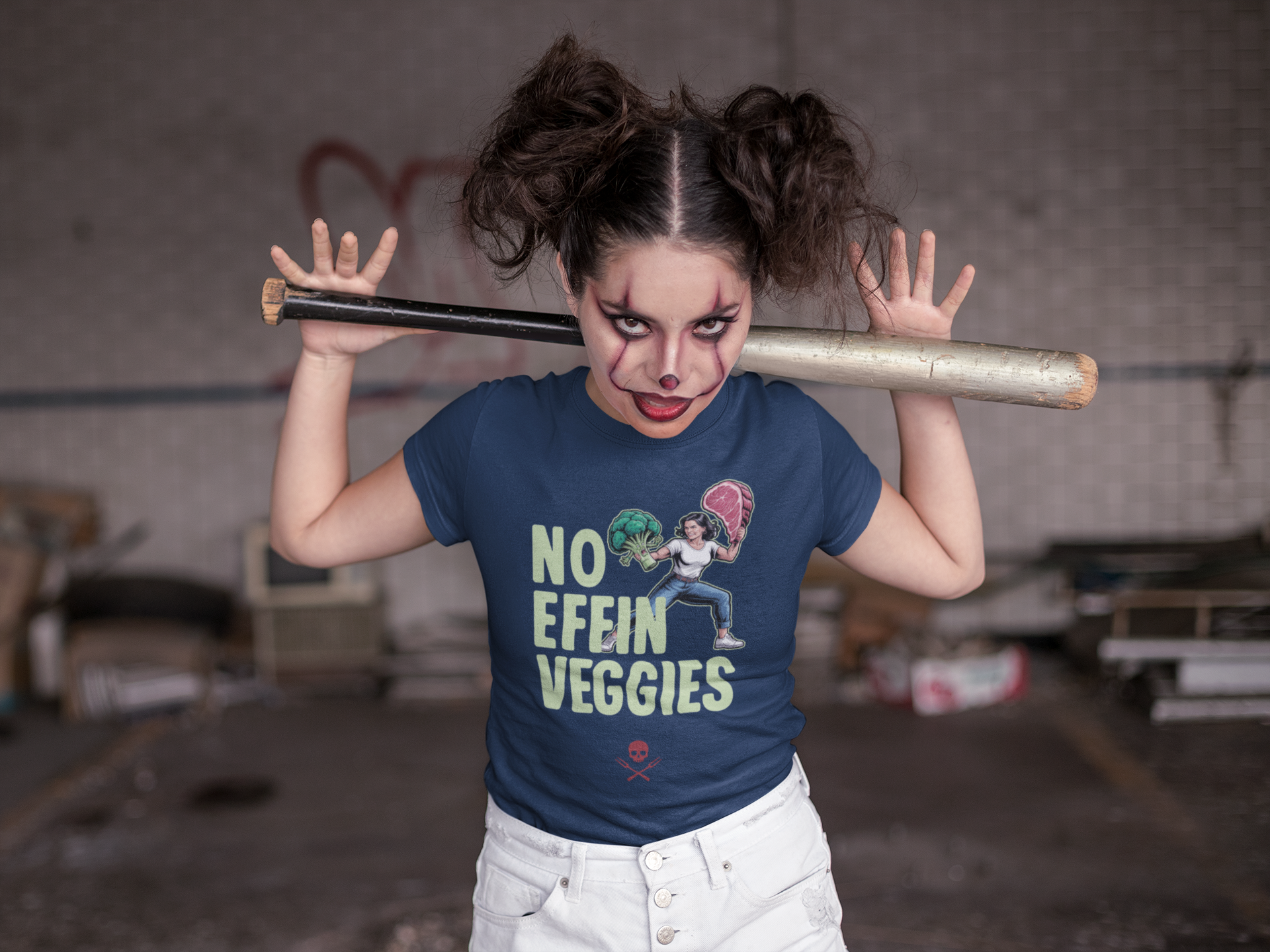 Whether you’re just over the lies of the food pyramid or fully committed to the carnivore life, this tee captures that primal, unapologetic energy. Featuring a ribeye-wielding warrior woman dishing out justice to a stalk of broccoli, it’s cheeky, fierce, and a little funny...just like the folks who wear it.